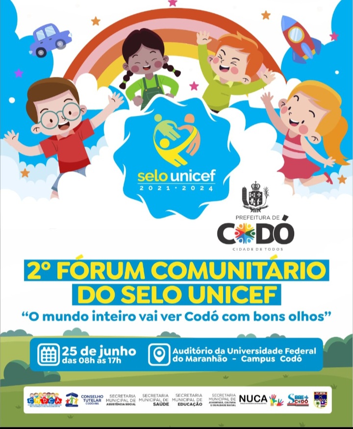 A Prefeitura Municipal de Codó através da Comissão Intersetorial do Selo UNICEF e o Conselho Municipal dos Direitos da Criança e do Adolescente vai realizar o 2º Fórum Comunitário do Selo UNICEF – Edição 2021-2024, nesta terça-feira (25), no auditório da Universidade Federal do Maranhão- UFMA Campus Codó. Com o tema “O mundo inteiro vai ver Codó com bons olhos”.