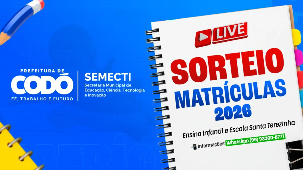 O sorteio acontecerá a partir das 9h e será transmitido ao vivo pelo canal oficial da Prefeitura de Codó no YouTube, garantindo transparência e amplo acesso aos responsáveis pelos alunos inscritos.