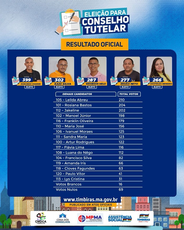 Conheça os conselheiros tutelares eleitos de Timbiras por Marcelo Rocha em 01/10/202301/10/2023 FacebookXWhatsApp Acompanhe o blog dos Cocais: clique aqui. Fonte: Ascom Continue lendo Artigo anterior Timon divulga resultado dos eleitos para o Conselho TutelarArtigo seguinte Conheça os cinco eleitos para o Conselho Tutelar de Codó