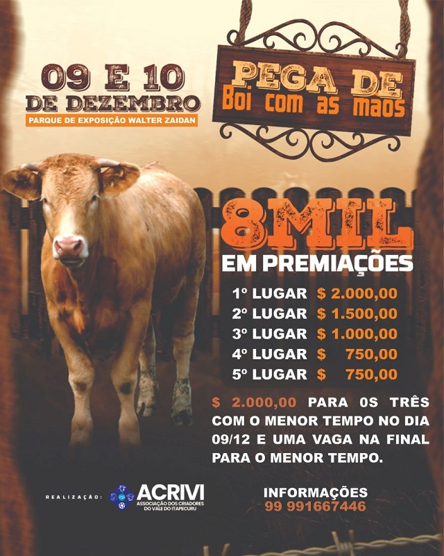 A Associação dos Criadores do Vale do Itapecuru – ACRIVI – realiza, nos dias 9 e 10 de dezembro, o 1º Pega de Boi com a Mão. A disputa acontece no Parque de Exposição Walter Zaidan, em Codó.