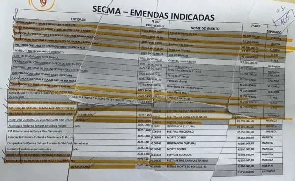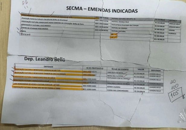 Entre os citados, Guilherme Paz aparece com cinco emendas indicadas junto à Secretaria de Cultura. Leandro Bello teria sete emendas, cada uma no valor de R$ 250 mil, enquanto Juscelino Marreca é mencionado oito vezes, também com emendas de R$ 250 mil cada.