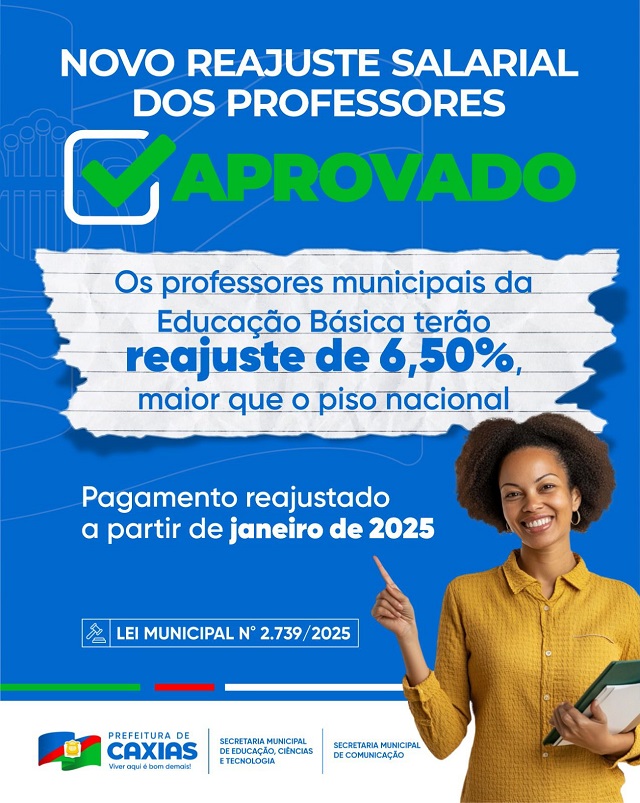 Em Caxias (MA), a Prefeitura Municipal realizou o reajuste de 6,50%, acima do Piso Nacional do Magistério de 6,27%, garantindo que a valorização dos profissionais é uma das pautas prioritárias da atual gestão municipal.