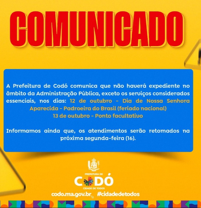 A Prefeitura de Codó não terá expediente nesta quinta e sexta-feira, (12 e 13). Quinta-feira, dia12, é feriado nacional pelo dia da Padroeira do Brasil, Nossa Senhora Aparecida. No dia seguinte, sexta-feira, será ponto facultativo para o funcionalismo público municipal.