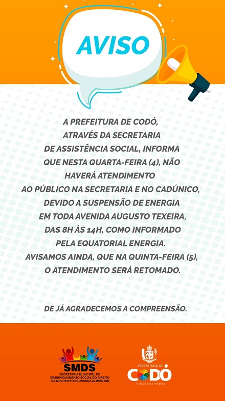A Secretaria Municipal de Assistência Social de Codó informa que não realizará atendimento ao público na sede da secretaria e no Cadúnico, nesta quarta-feira (4).